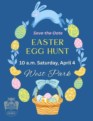 City of DeRidder - City Hall and DeRidder Parks and Recreation will hold an Easter Egg Hunt at West Park at 10 a.m. Saturday, April 4.Come for egg hunting, candy, and fun! We will hide several grand prize eggs!Food will also be available for purchase for those who want to stay at the park for lunch.Join the fun as we restart this tradition!Save-the-date!Location:West ParkDate/Time Information:10 a.m. Saturday, April 4.Contact Information:City of DeRidderSet a Reminder: